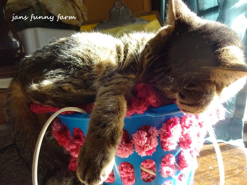 Rusty: When Jan laid her knit hat and scarf in the basket to keep Percy from sleeping on it, Percy just moved with them, but he was afraid if he closed his eyes, Micah would steal his new bed.